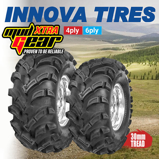 A strong and versatile ATV tire, with 30mm tread depth. The Innova Mudgear Xtra ATV Tyre is a beefed up version of the Mudgear, but still hits the mark as an all around utility tyre that is also great for mud chucking! Impressive tread design provides exceptional performance in rough terrain, as the large Chevron-type tread digs in to pull you out of difficult conditions. A deep 30mm tread and an extra beefy 4 ply carcass with built-in rim protector (6 ply carcass on the 14" versions, suitable for SxS and UTV fitments), makes for surefooted traction and mud slinging.